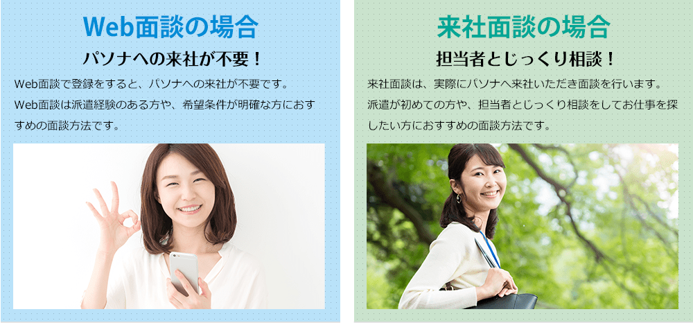 パソナの登録自体は2分程度で終わります。そして、webで面談ができるので忙しい人や、派遣会社を変えたい人も簡単に連絡が取れます。