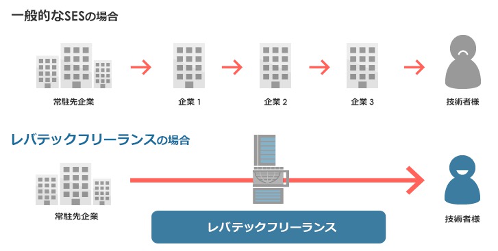 一般的なSES(システムエンジニアリングサービス)契約は常駐先の会社から下請け人だして、孫請け会社に出して、予算をどんどん中抜けされて最後に安い給料で働かされてしまうフリーランスとなるわけです。