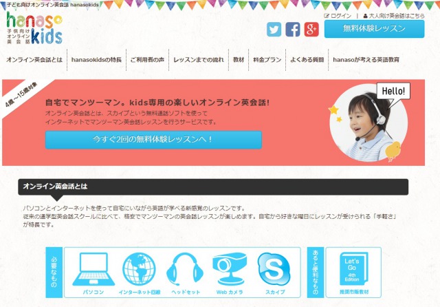 無料の英語教材で子供が楽しく勉強できる!ハナソキッズは4~15歳まで限定の子供向けオンライン英会話教室です。高校生以上の大人のスカイプ英会話と分けているので、先生も子供に優しい先生ばかりです。
